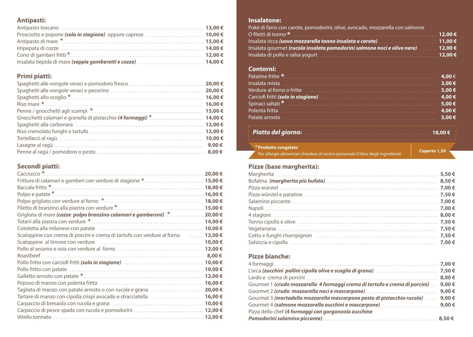 I prodotti contrassegnati dal "*" indicano prodotti congelati, tranne per le cozze e le vongole che sono fresche